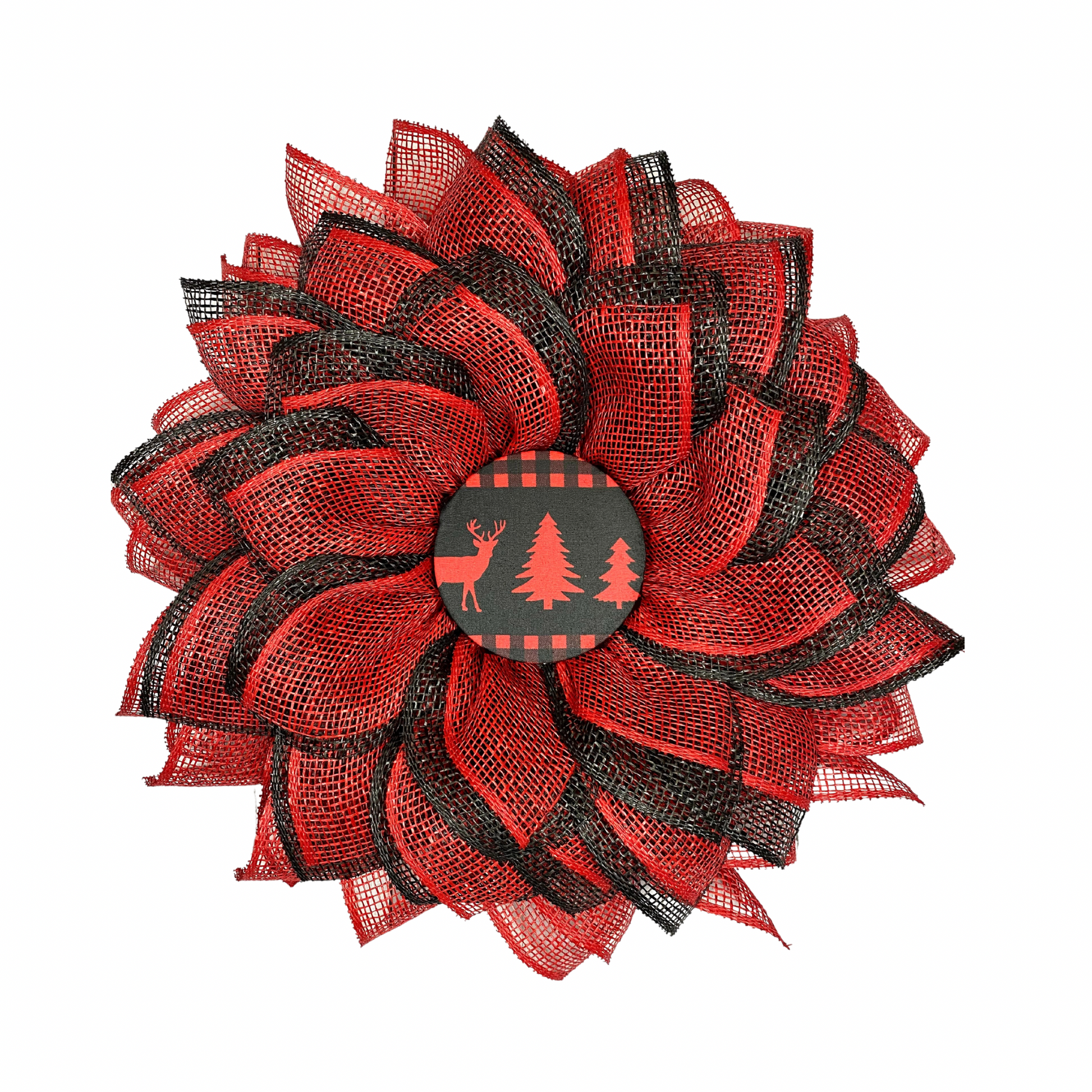 A red and black winter flower with the center showcasing a deer and pine trees gives this wreath a cabin feel! The petals are cut using a wood-burning tool to lessen fraying.