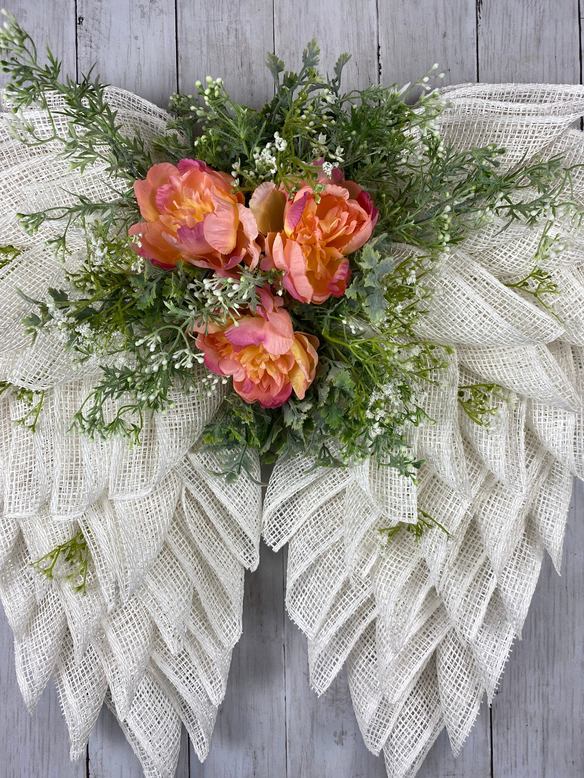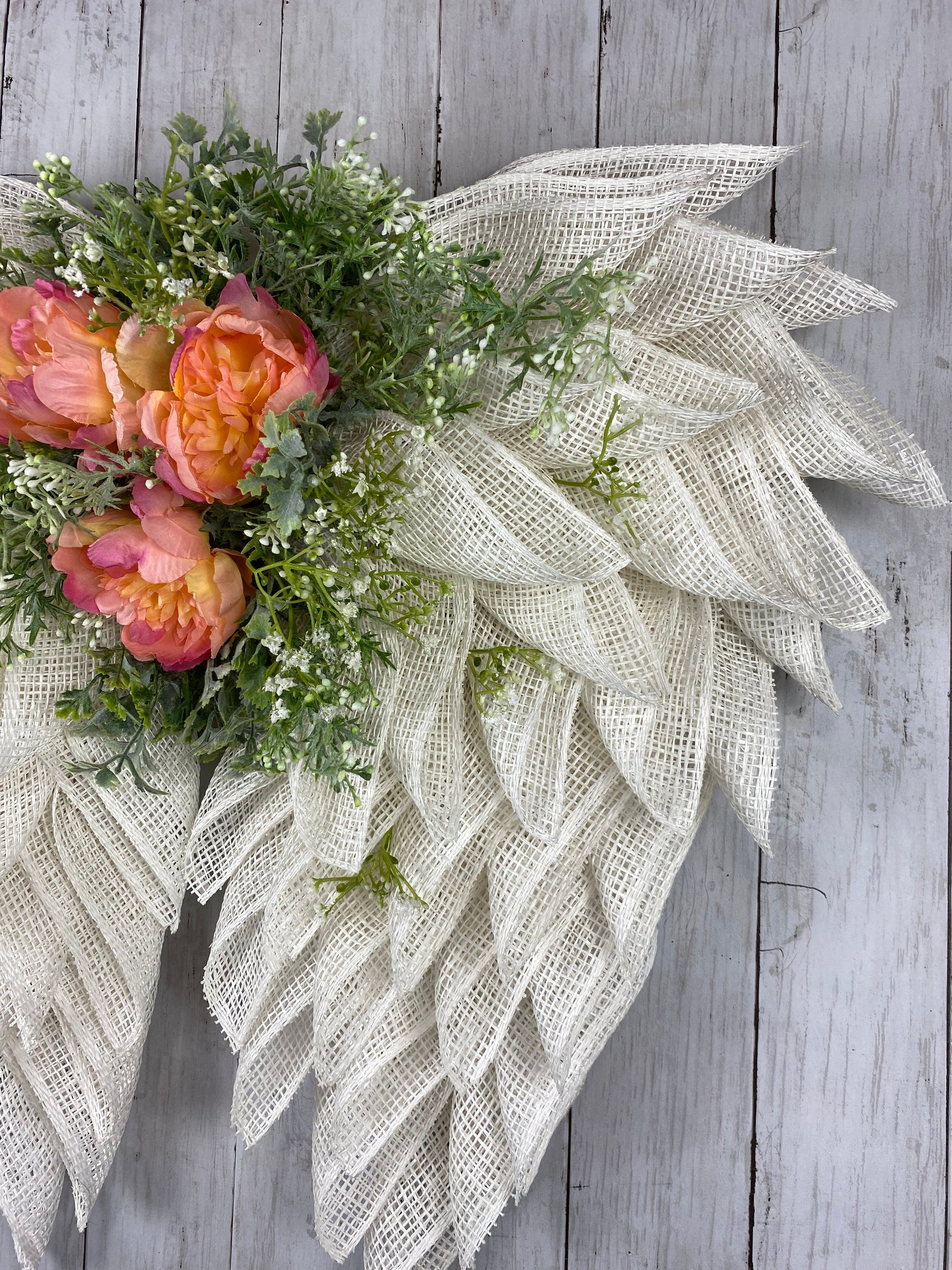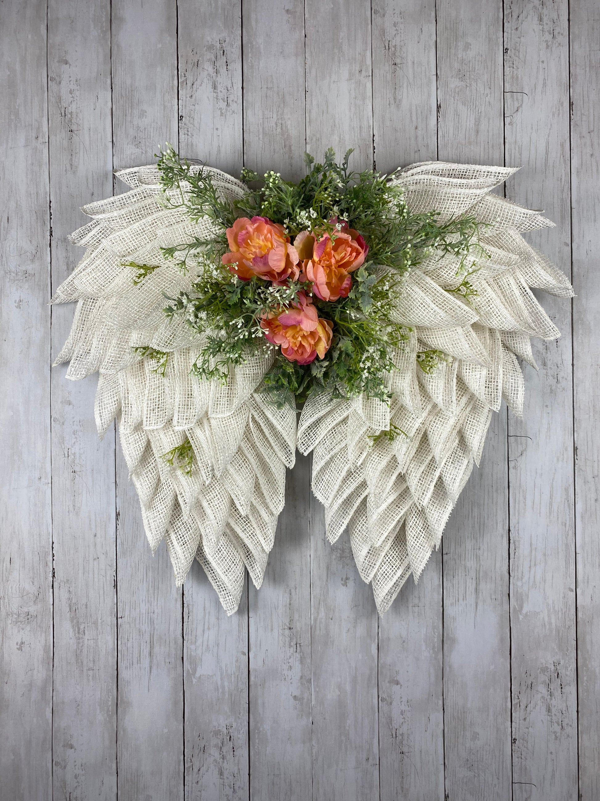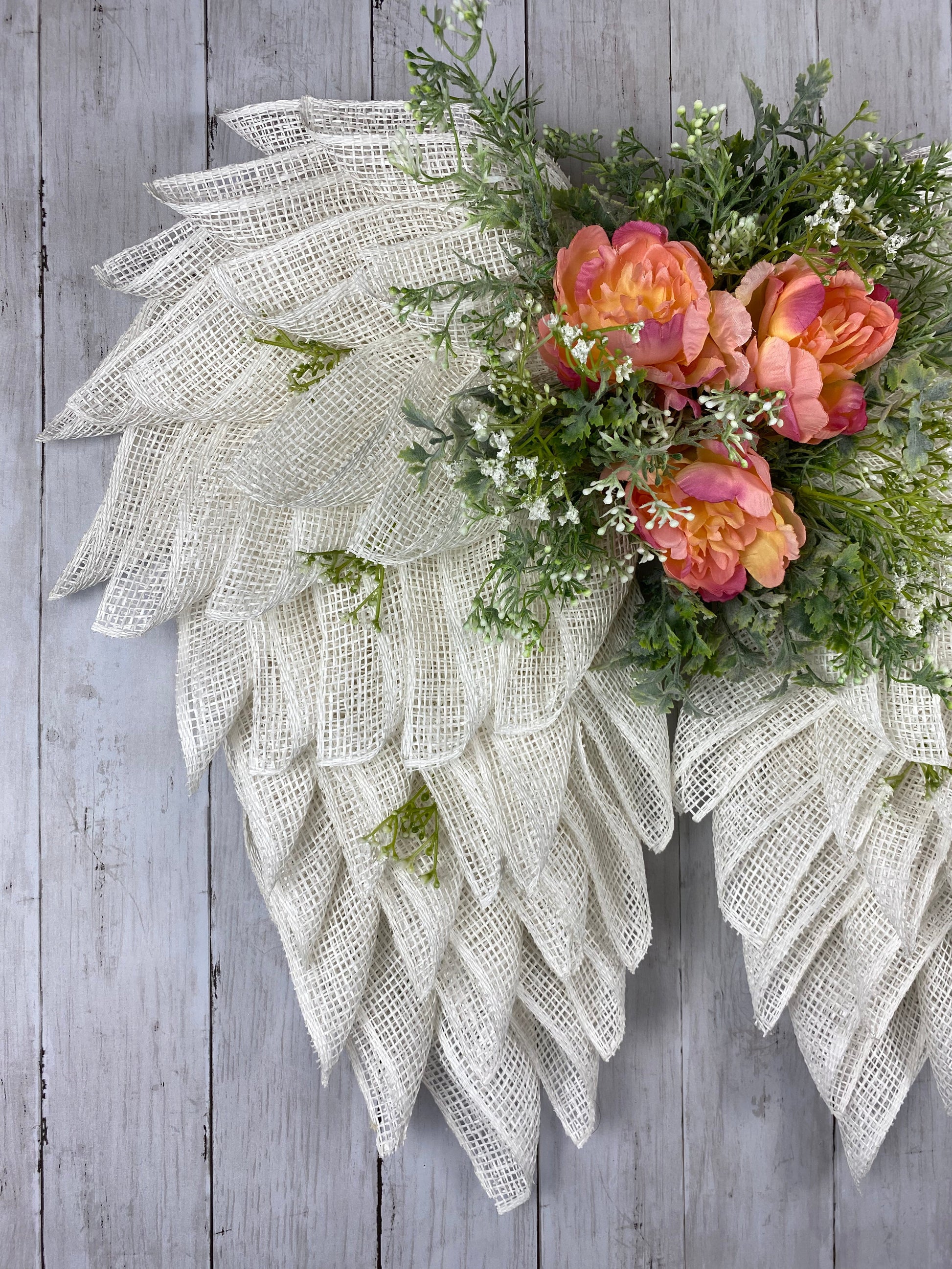 Using white poly burlap mesh, this beautiful angel wing wreath is a perfect piece to display on your front door, above a fireplace, or at a funeral to honor a loved one.