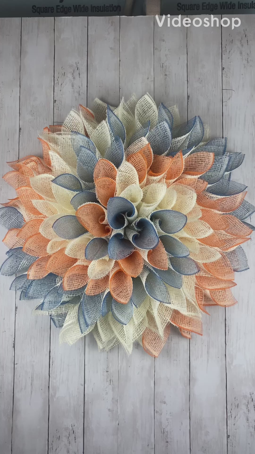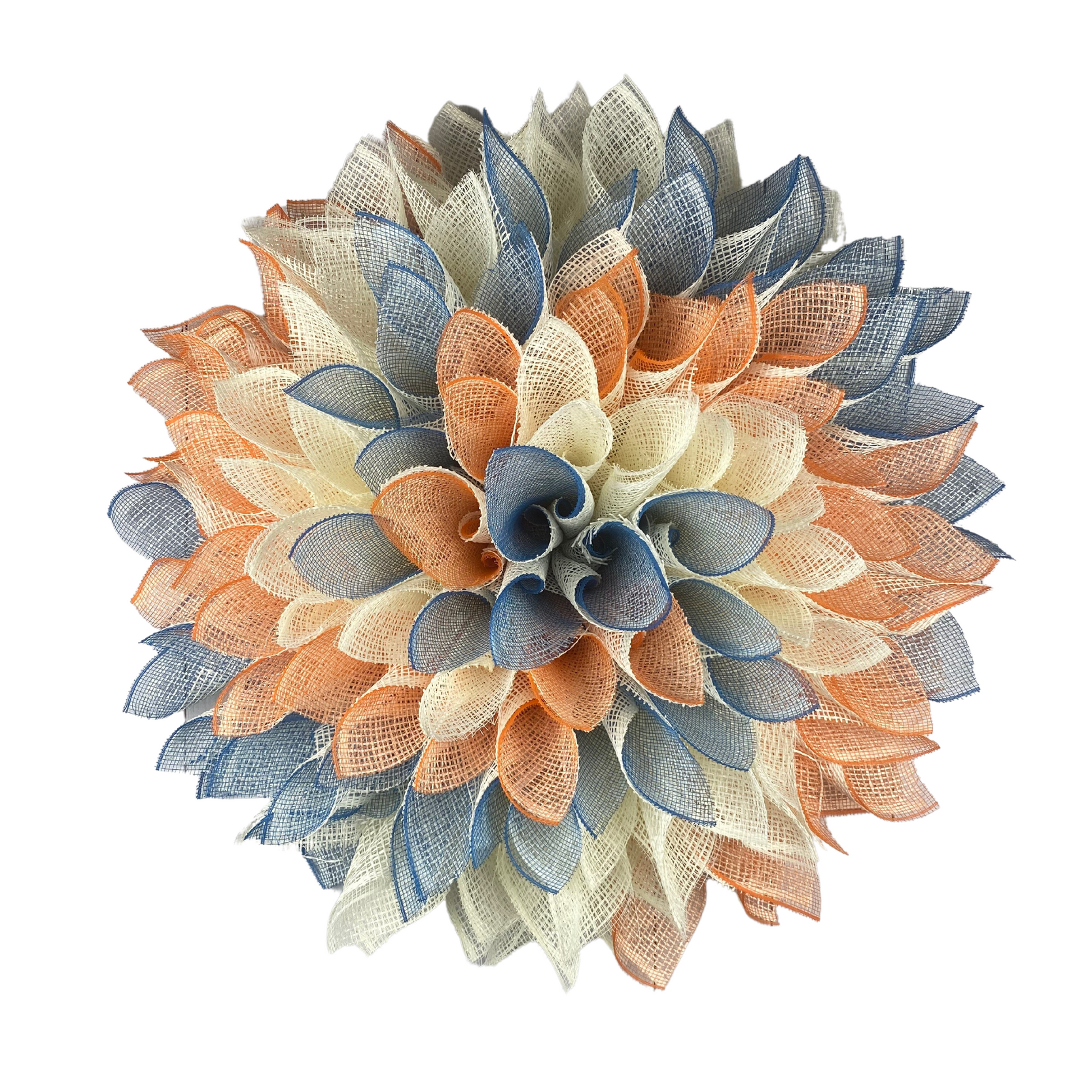 This unique Fall dahlia wreath in colors of orange, denim blue and cream makes that perfect gift for your beloved mother, sister, or good friend.